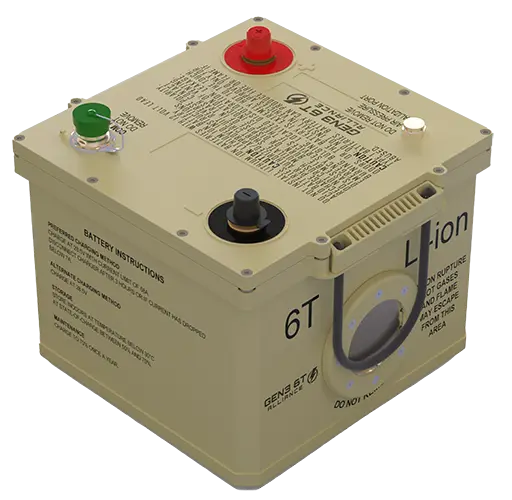 The Generation 3 lithium-ion 6T NATO format battery (GEN3 6T) has been custom-designed for compliance with MIL-PRF-32565C. This advanced battery solution offers significant capabilities tailored to military needs.